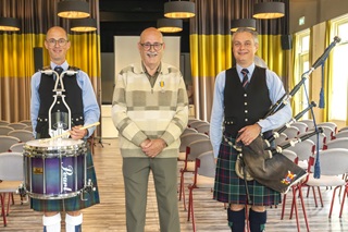 De heer Hekhuis ontvangt de Koninklijke Onderscheiding voor zijn forse vrijwillige inzet voor de Zeeuwse doedelzakband Inter Scaldis Pipes and Drums.